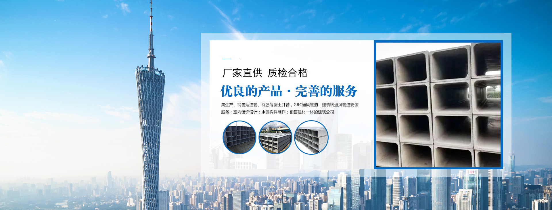 廣東天富建材有限公司是集生產、銷售煙道管、鋼筋混凝土井管、GRC通風管道,建筑物通風管道安裝服務、室內裝飾設計、水泥構件制作于一體的建筑公司。公司擁有一支高素質、高水平、年輕的團隊,秉承“品質·服務”的經營理念,為客戶提供科學經濟的方案及技術指導。